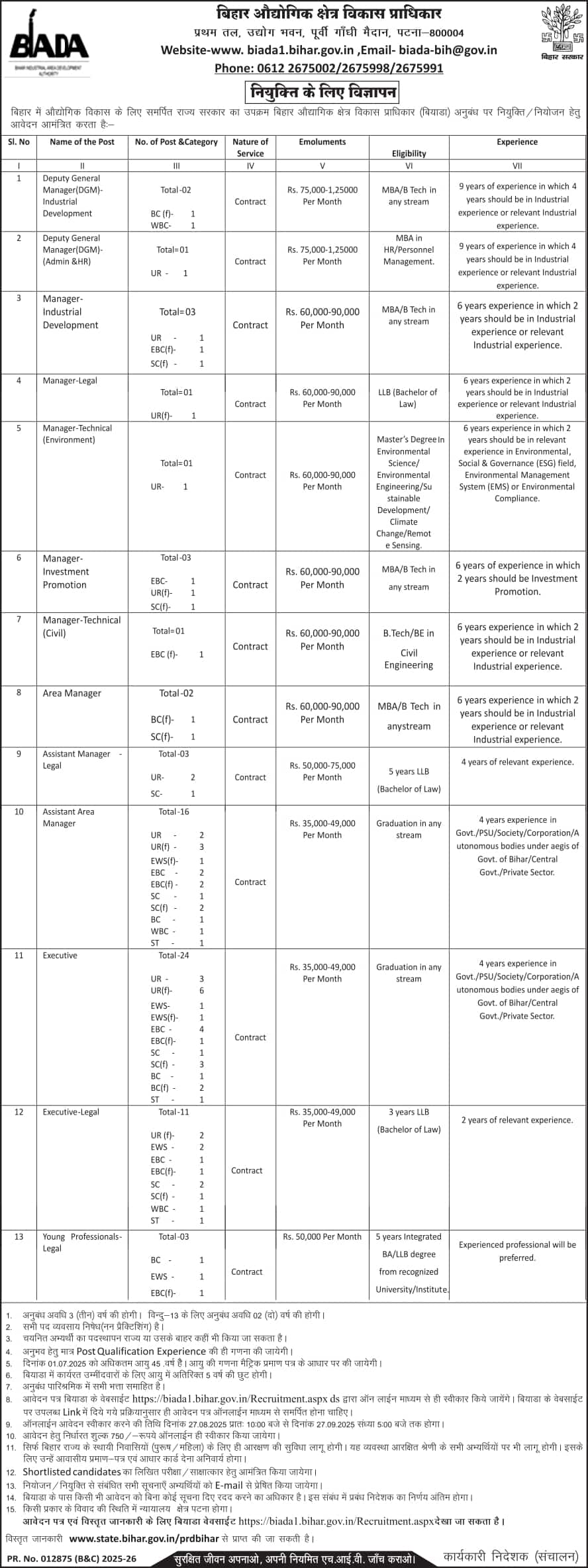 Bihar Industrial Area Development Authority (BIADA) has released an excellent recruitment notification for various positions. An official notice has been published providing detailed information regarding the available posts, eligibility criteria, and application dates.
