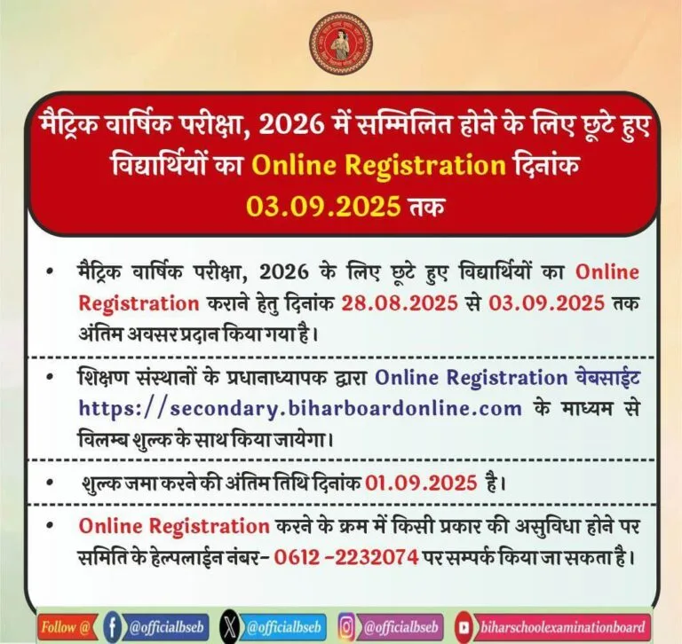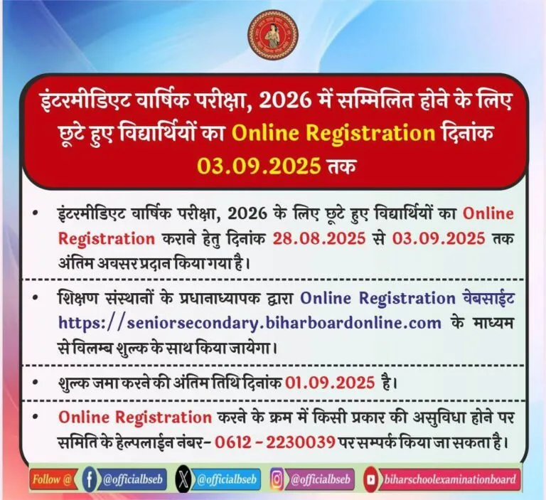 All students who have not yet registered but wish to appear for the Bihar Board Matric (Class 10) or Intermediate (Class 12) Annual Exams 2026 can apply during this last registration window.