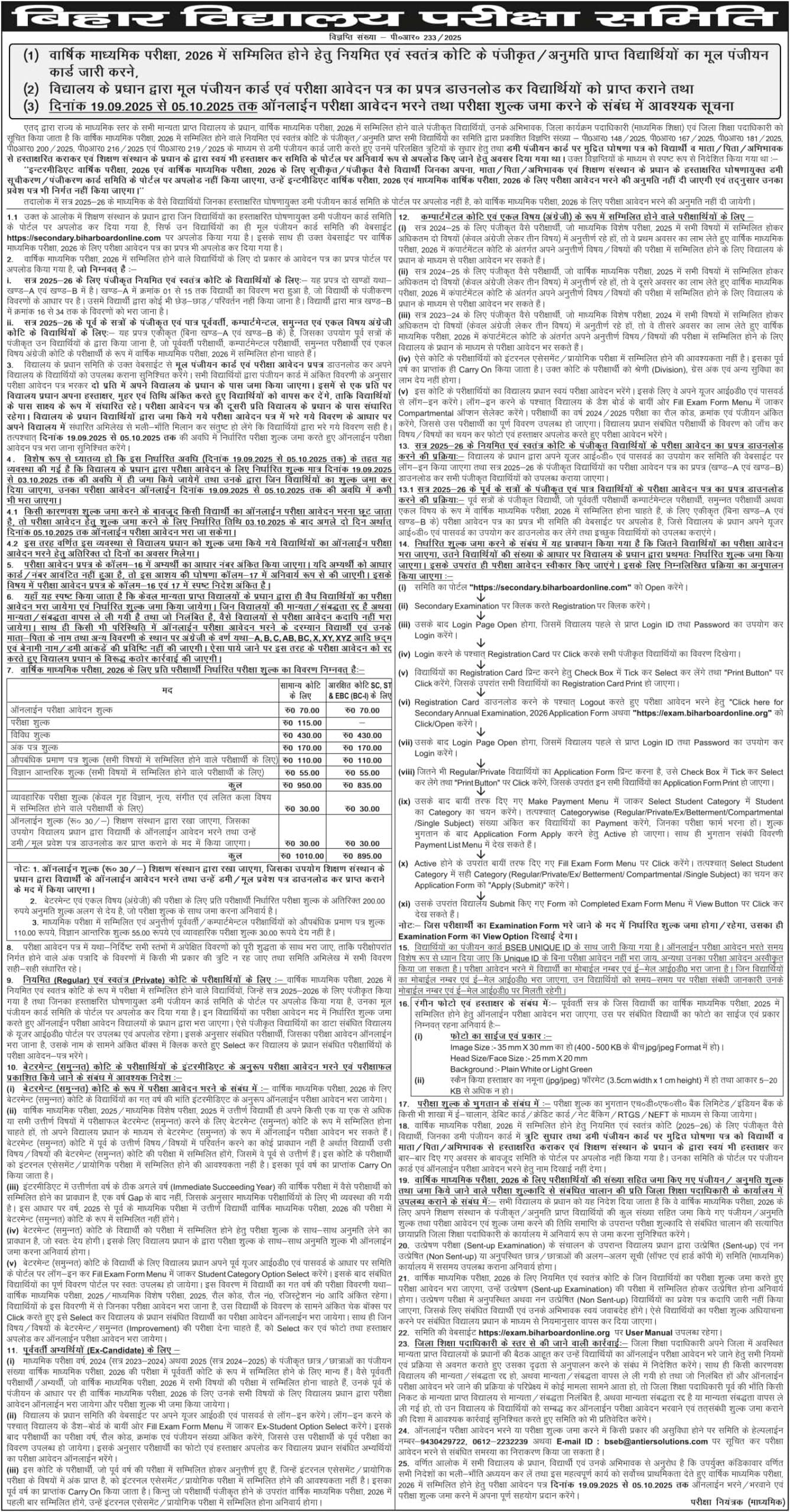 The Bihar School Examination Board has officially started the process for filling out exam forms for the Annual Secondary Examination 2026 and the Intermediate Annual Examination 2026. An official notice has been issued by the Bihar Board providing details about the application process.