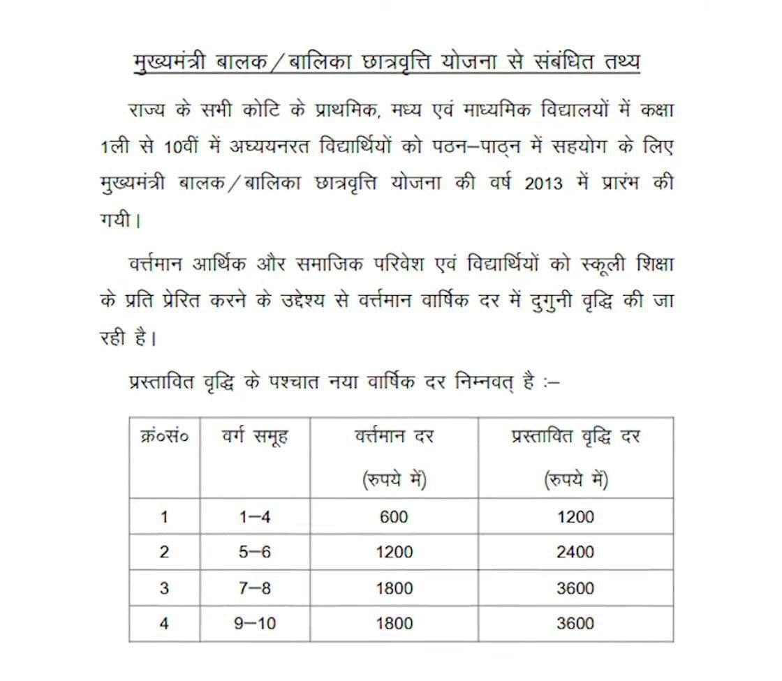 For students of Classes 1 to 8, studying in government, government-aided, or minority-aided primary schools, as well as in recognized madrasas and Sanskrit schools, the annual scholarship amounts under the Chief Minister’s Boy/Girl Scholarship Scheme have been revised for the financial year 2025-26. The updated rates are: ₹1,200 for Classes 1–4 (previously ₹600), ₹2,400 for Classes 5–6 (previously ₹1,200), and ₹3,600 for Classes 7–8 (previously ₹1,800). This revision has been officially approved, and the total annual expenditure for the scheme has been set at ₹3,00,00,00,000 (Three billion rupees).