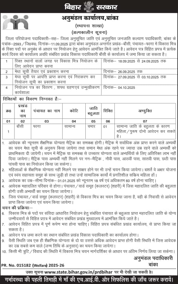 Another recruitment for Bihar Vikas Mitra has been announced. This time, the vacancies have been released for Banka district in Bihar. Applications for these positions have officially started, with detailed information provided through the official notice.