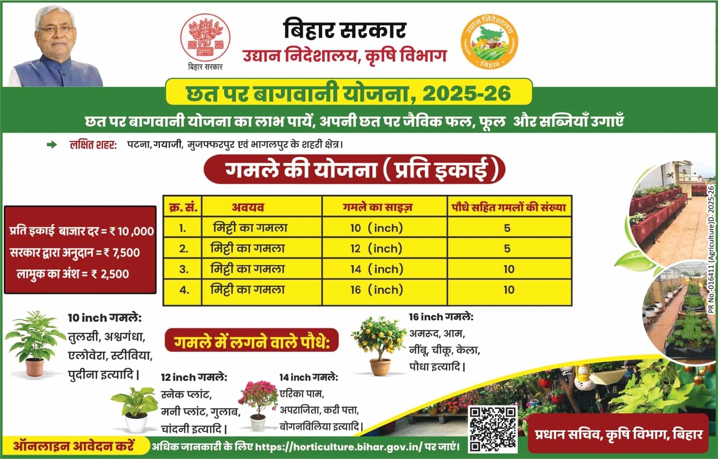 Bihar Government’s Directorate of Horticulture, under the Agriculture Department, has launched online applications for the Rooftop Gardening Scheme 2025. This initiative provides financial assistance to individuals who wish to grow plants in pots on their rooftops. An official notice has been issued to inform citizens about the start of the application process. Those interested in availing benefits under the Chhat Par Bagwani Yojana 2025 are encouraged to apply promptly. Detailed information about the scheme, the benefits offered, and the step-by-step application process is available online. Applicants can click the link provided to submit their applications and learn more.