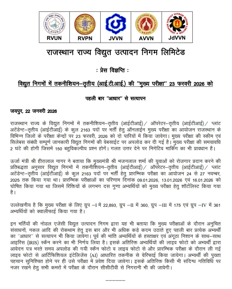 The Rajasthan Rajya Vidyut Utpadan Nigam Limited (RRVUNL) is a government-owned power generation company operating across Rajasthan. It periodically conducts recruitment drives to fill technical and non-technical posts in its power plants. For the 2025–26 recruitment cycle, RRVUNL announced 2163 vacancies for Technician‑III, Operator‑III, and Plant Attendant‑III posts. Candidates who applied and cleared the preliminary exam are now eligible to download the mains admit card. These jobs are highly sought-after due to their stable public-sector benefits and career growth opportunities.