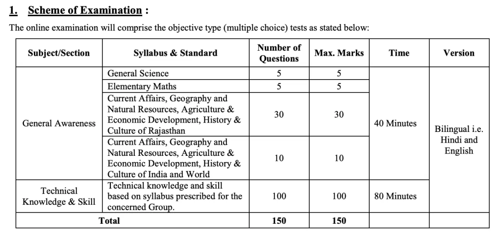 The RRVUNL Technician Various Posts Mains Exam 2026 will consist of 150 questions covering multiple subjects relevant to the post applied for. Each question carries 1 mark, and there is no negative marking. Candidates will have a total of 120 minutes to complete the exam.